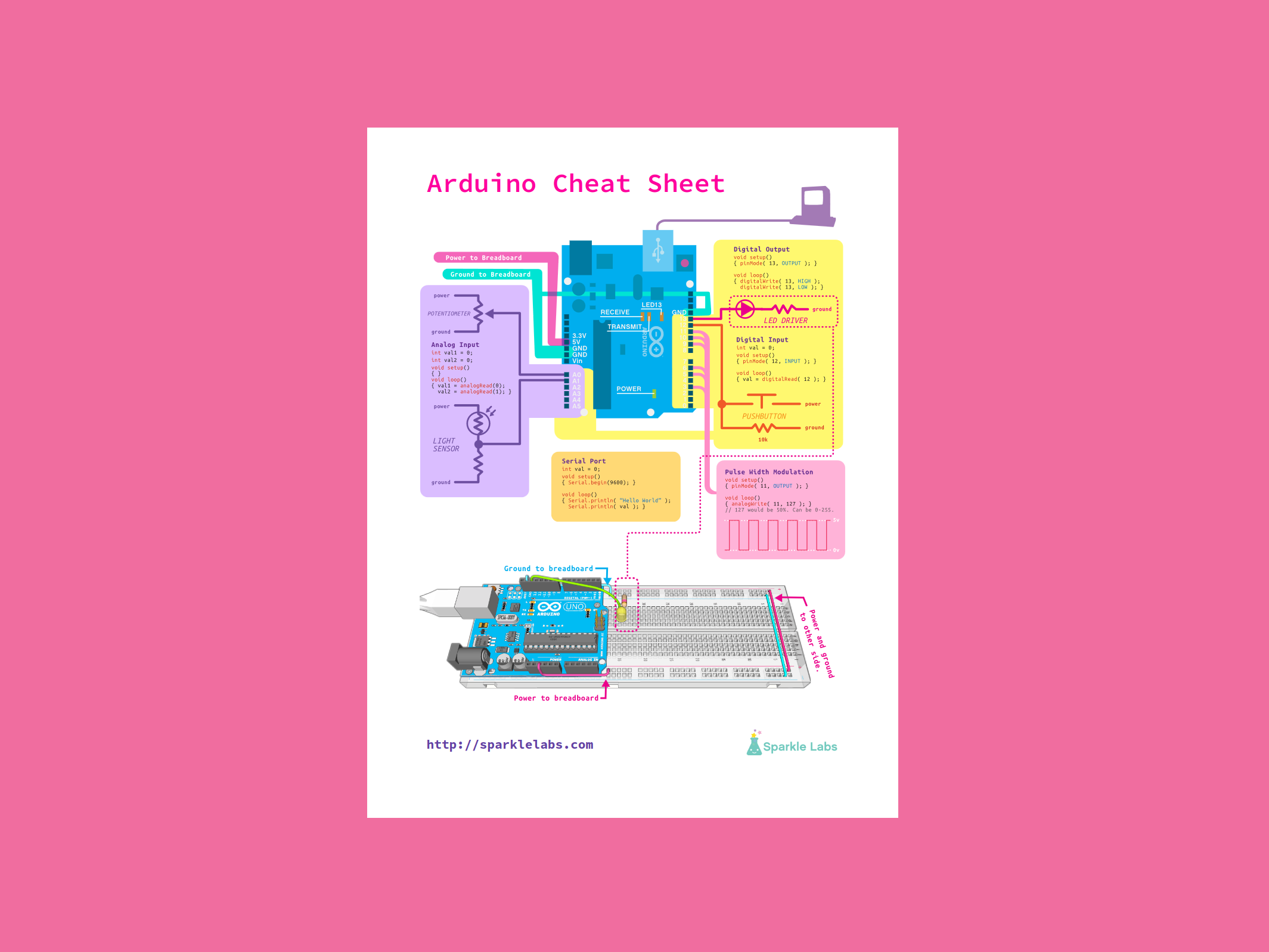 The Getting Started with Arduino Uno page contains all the information you need to configure your board, use the Arduino Software (IDE), and start tinkering with coding and electronics.